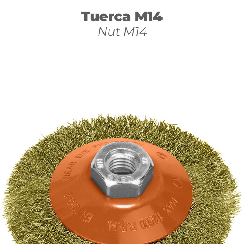Cepillo Oblicuo Con Alambre De Acero Latonado Rosca M14, Ø 100 mm. Alambre de Ø 0,30 mm.