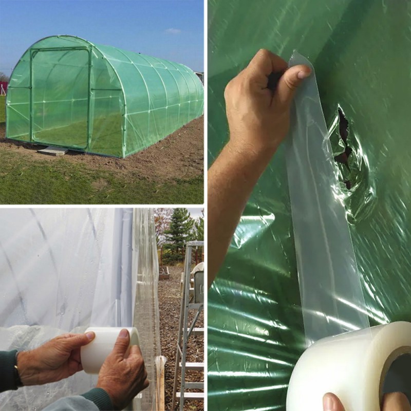- Presentamos esta cinta adhesiva especialmente diseñada para la reparación de invernaderos y láminas de plástico.