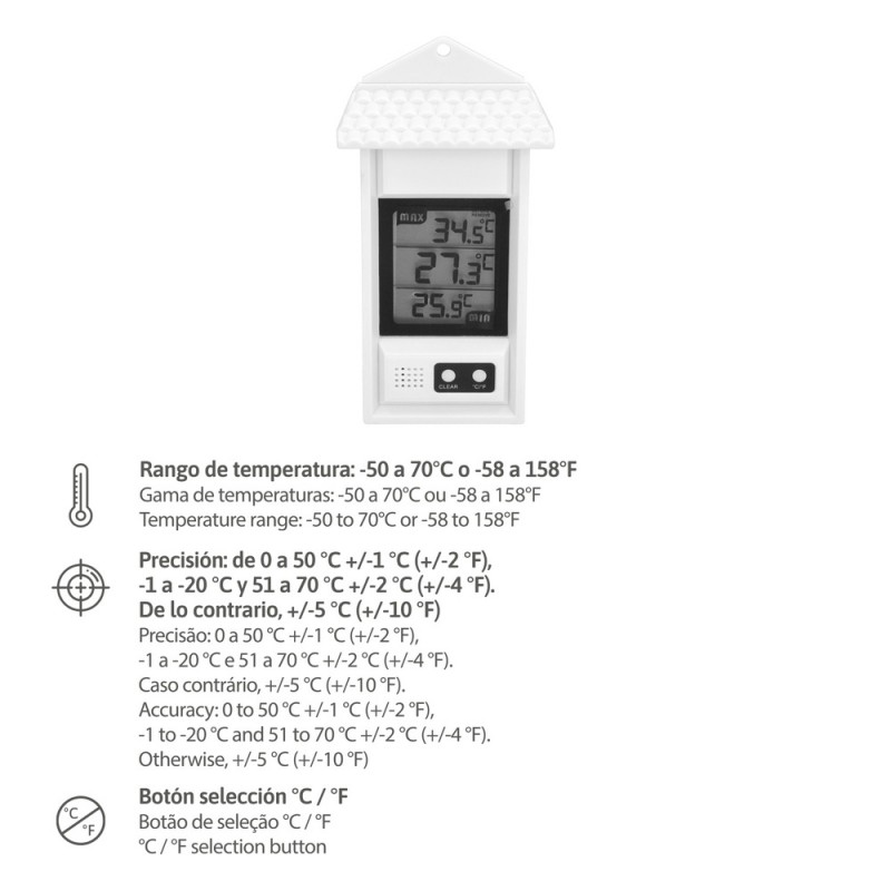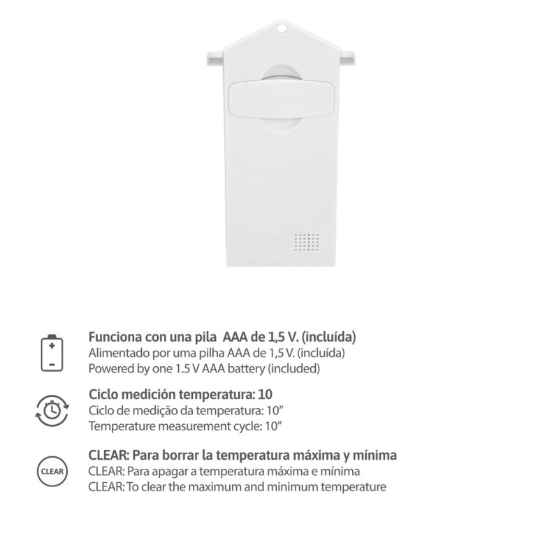 - Para facilitar su uso, dispone de una función de borrado (Clear) que permite resetear los valores de temperatura máxima y mínima. Y en caso de necesitar cambiar la pila, basta con retirar la tapadera sin preocupaciones, ya que en su primer uso puede estar ajustada de forma segura.