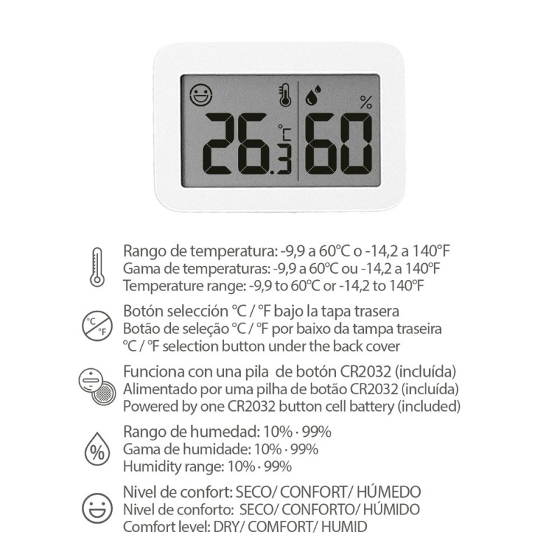 - Además, cuenta con un nivel de confort que indica si el ambiente se encuentra seco, en confort o húmedo, para que puedas ajustar la temperatura y humedad de tu hogar según tus necesidades. Incluye un higrómetro para medir la humedad con mayor precisión.