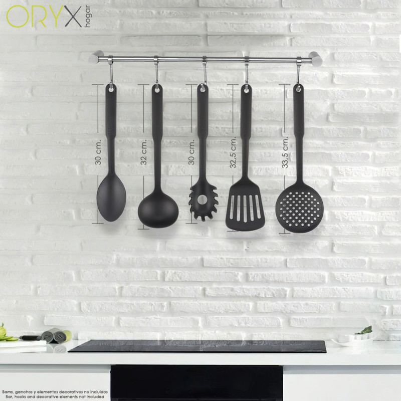 - Realizado en nylon, material ligero y resistente. Material similar a la silicona, ya que ambos materiales no absorven olores ni sabores ademas pueden usarse en todo tipo de sartenes y ollas, ya uqe no rayan la base.