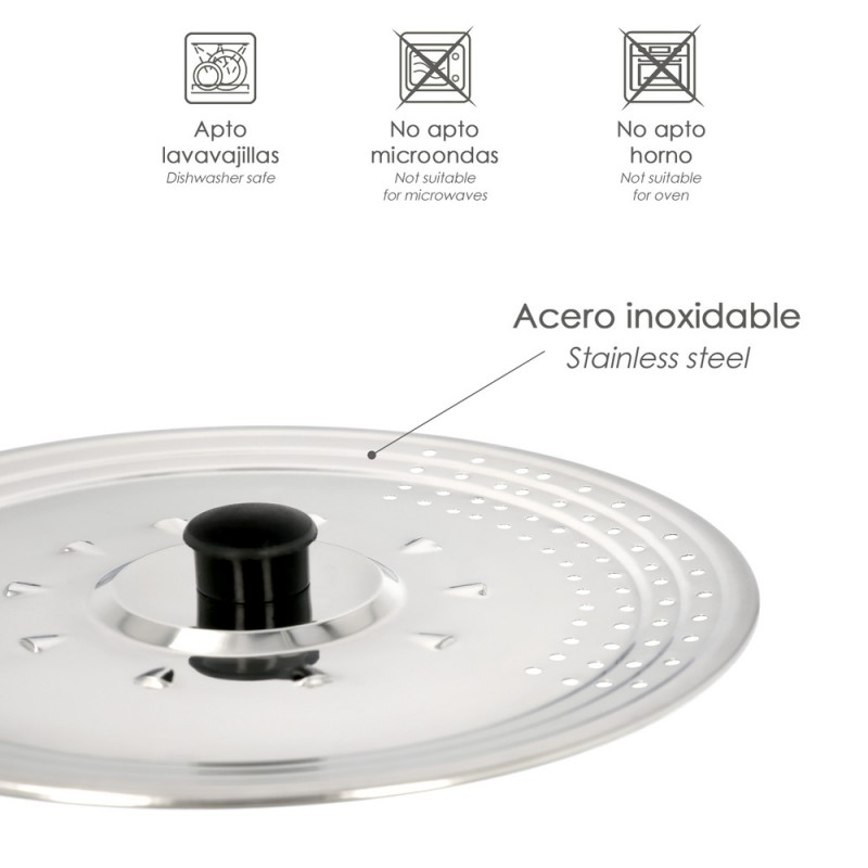 - Ademas se ha integrado una serie de orificios para ser usada como escurridor, por lo que ademas de tapa antisalpicaduras se puede usar como colador.